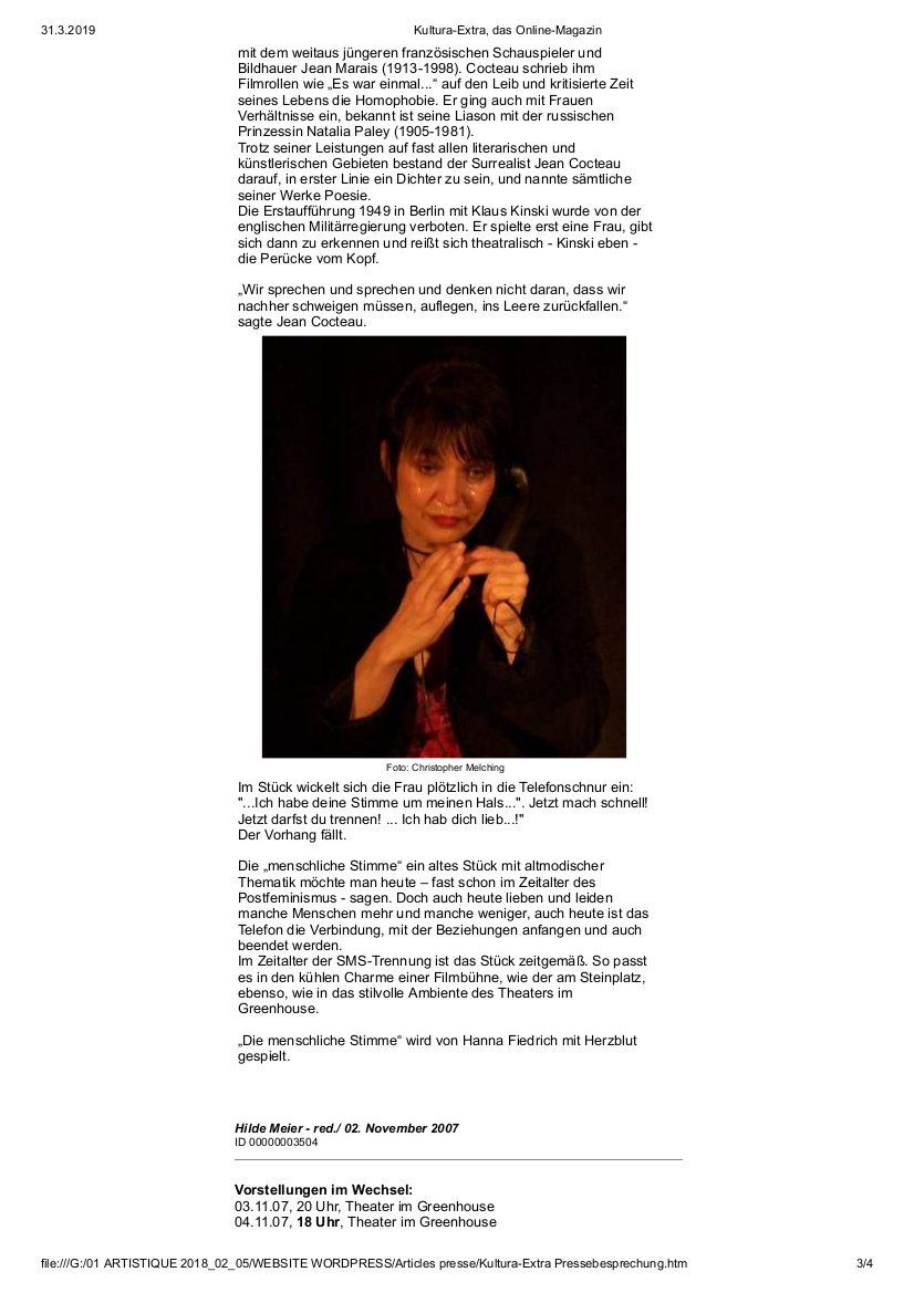 Venez découvrir nos créations pour votre programmation ainsi que le parcours de l’artiste pour des engagements en langue française ou allemande (théâtre, télévision, cinéma, audio, animation d’ateliers de théâtre pour enfants et adultes).